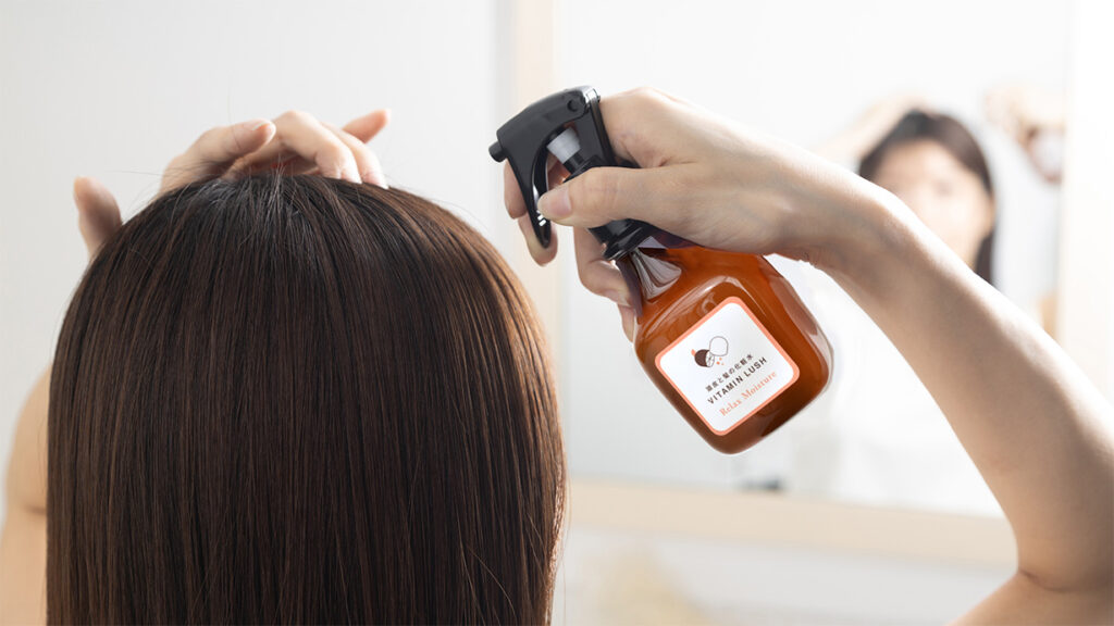 ▼写真では、アルコールフリーの頭皮用化粧水「ビタミンラッシュ」を使用しています。