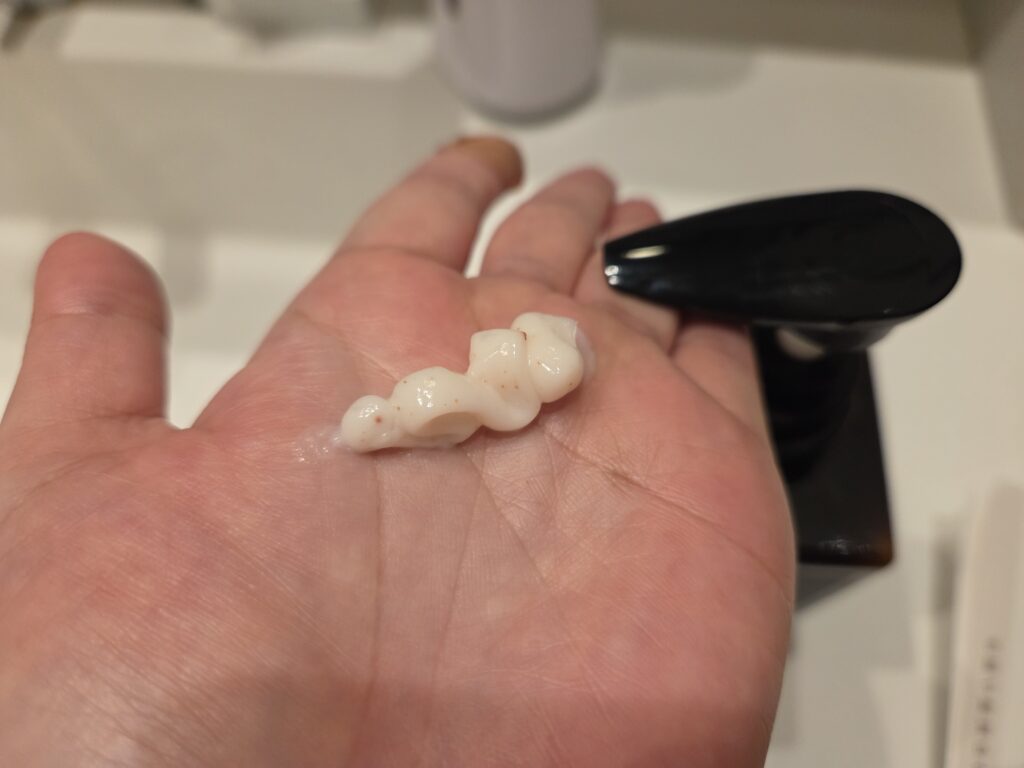 テクスチャはこんな感じです。しっかり硬め。レチノールカプセルのツブツブが見えますね。